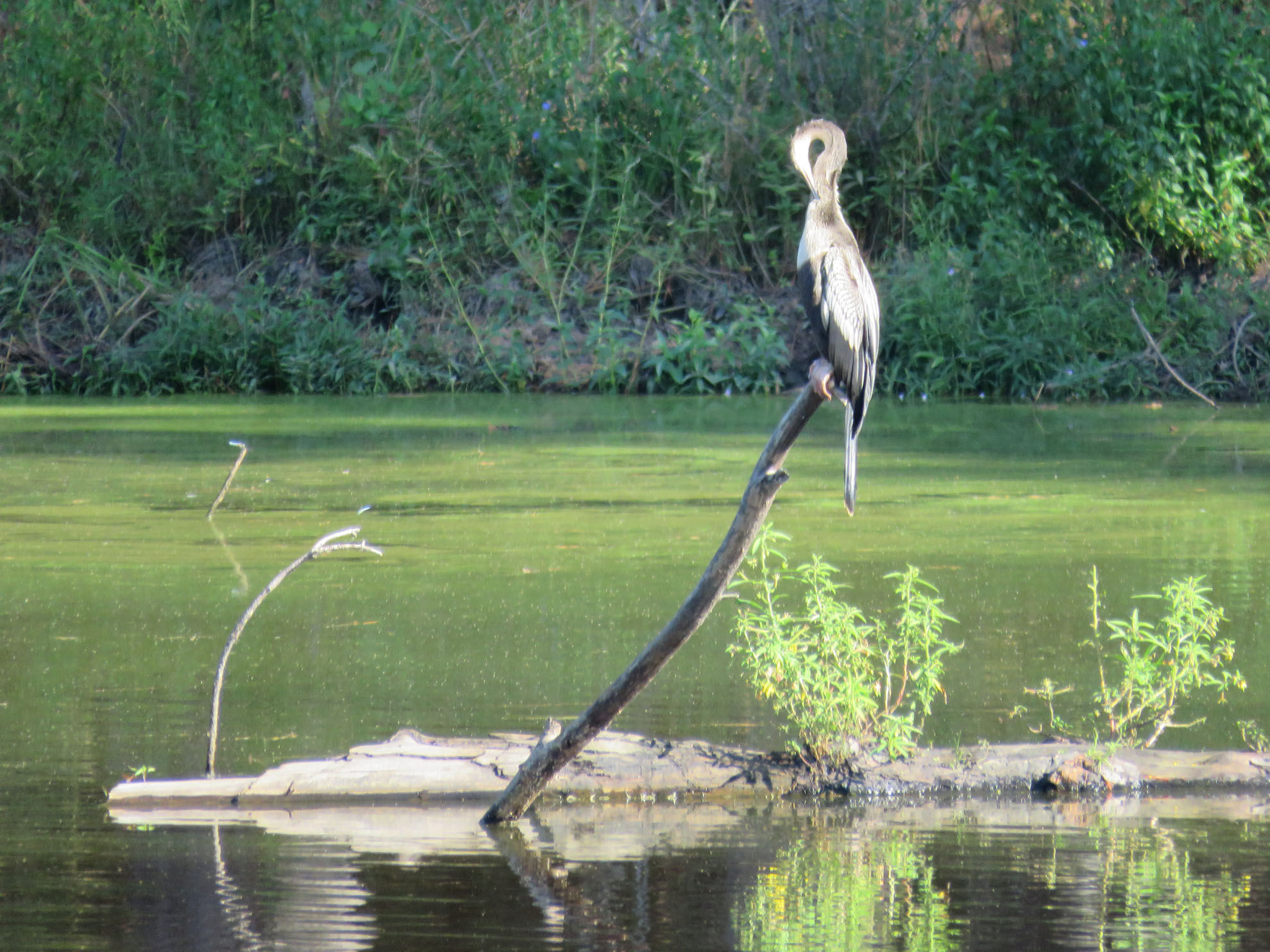 As I was taking pictures of the butterfly, I noticed over its “shoulder,” an unusual bird perched on a fallen tree out in the pond.