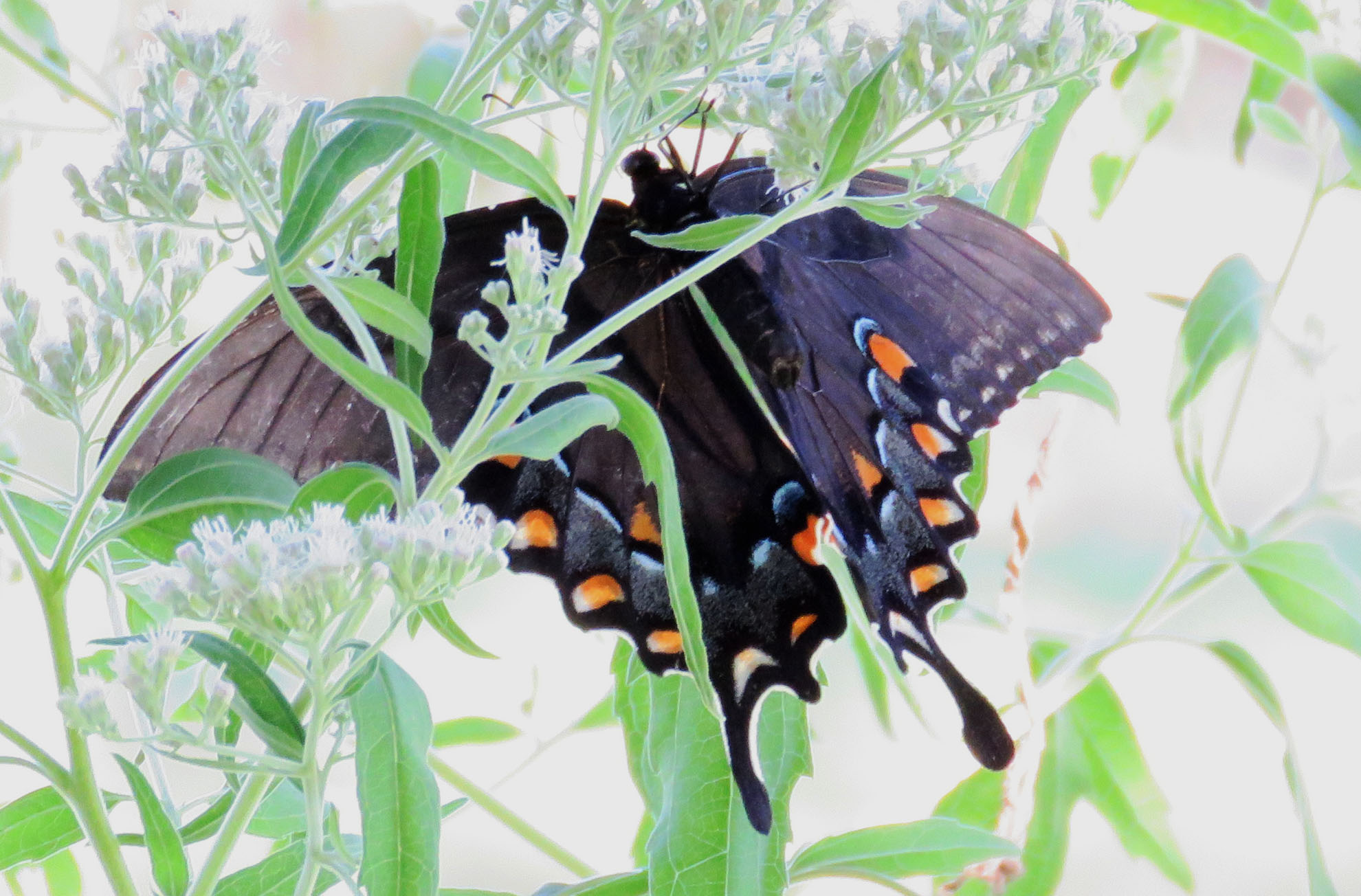 On Labor Day, I stepped outside about 5 PM, to feed the sheep before heading to a concert at a local winery. In a late-flowering boneset plant, I noticed a large dark shape that I thought was a bird. It turned out to be a Tiger Swallowtail butterfly.