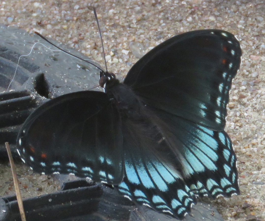 Red-spotted Purples have the same coloring, but they do not have the swallowtail, and are in the Nymphalid family. They are thought to be mimics of Pipevine Swallowtails.