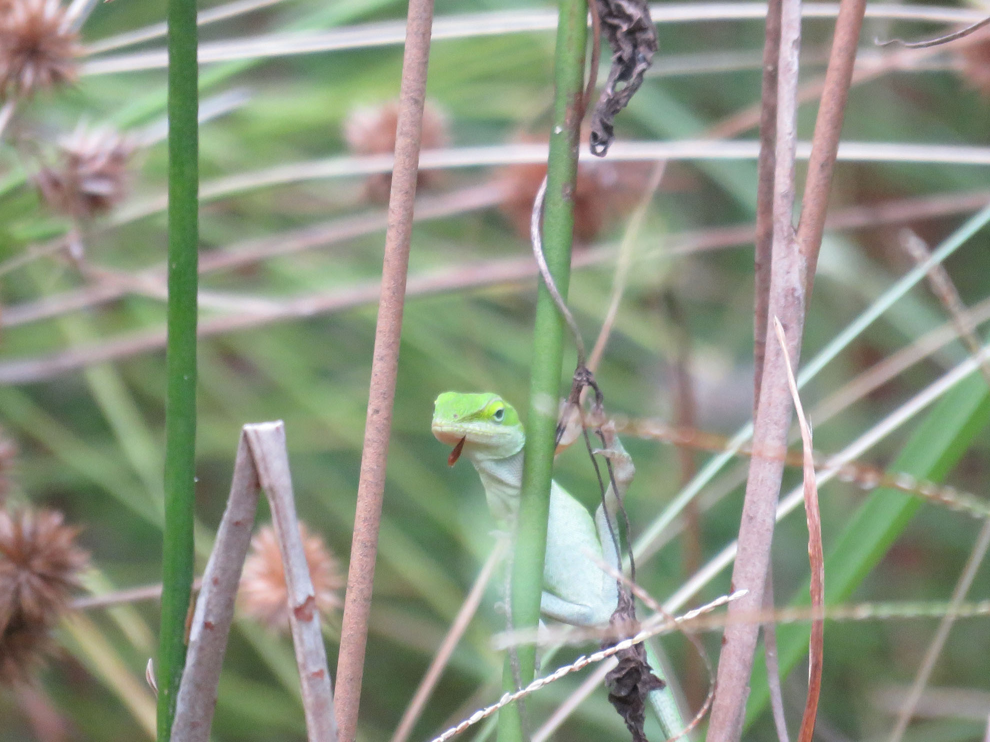 It was a little Green Anole. I zoomed in and what looks to be a bug’s wing was hanging out of its mouth.