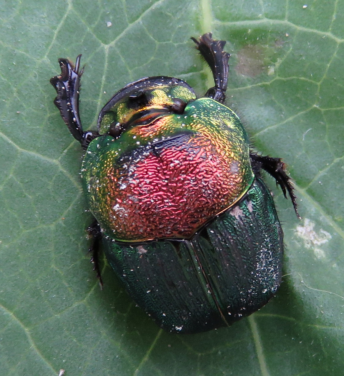 Male rainbow scarabs have big horns in the center of their heads, like rhino horns.