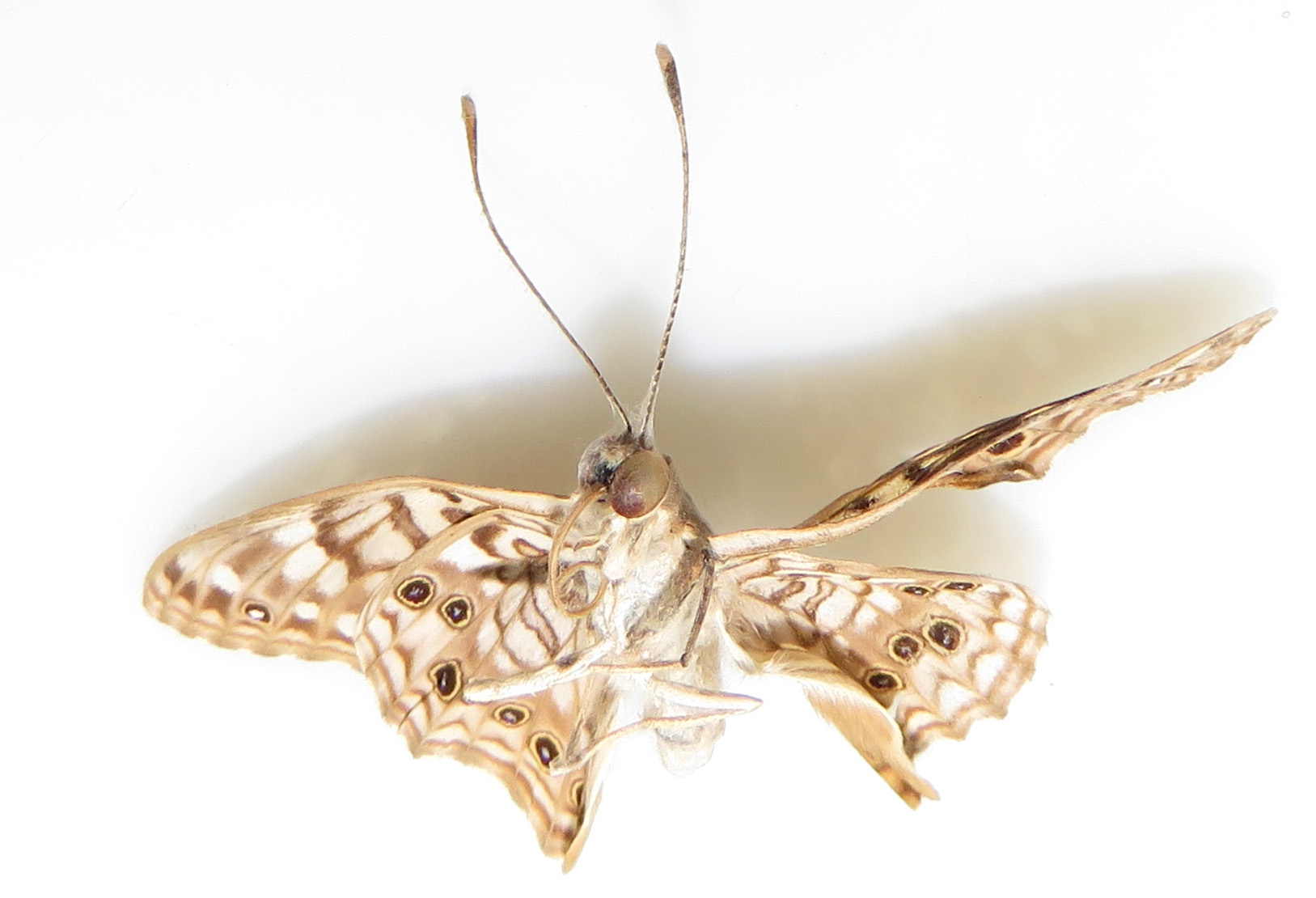 This sadly deceased individual is a Hackberry Emperor, Asterocampa celtis.  Its wing span is about 2 inches (5 cm) across, and it belongs to the nymphalid, or brush-footed butterfly, family.  According to authors John and Gloria Tveten*, there may be three broods of caterpillars a year.  The caterpillars are yellow-green with spiny “antlers” on their heads – I have never seen any but I will have to keep a look out.