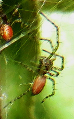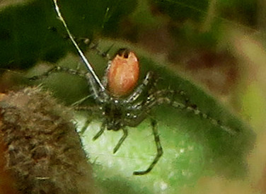 I had been wondering where all the Green Lynx spiders had gone, when I noticed a goatweed plant with a big, dead-looking clump on top.  What I thought was a bunch of tiny red bugs turned out to be this recently hatched family of baby spiders, and then I finally saw the mama Green Lynx (Peucetia viridans) hanging around underneath the nest.  When she noticed me, she ran up quickly to defend her babies.