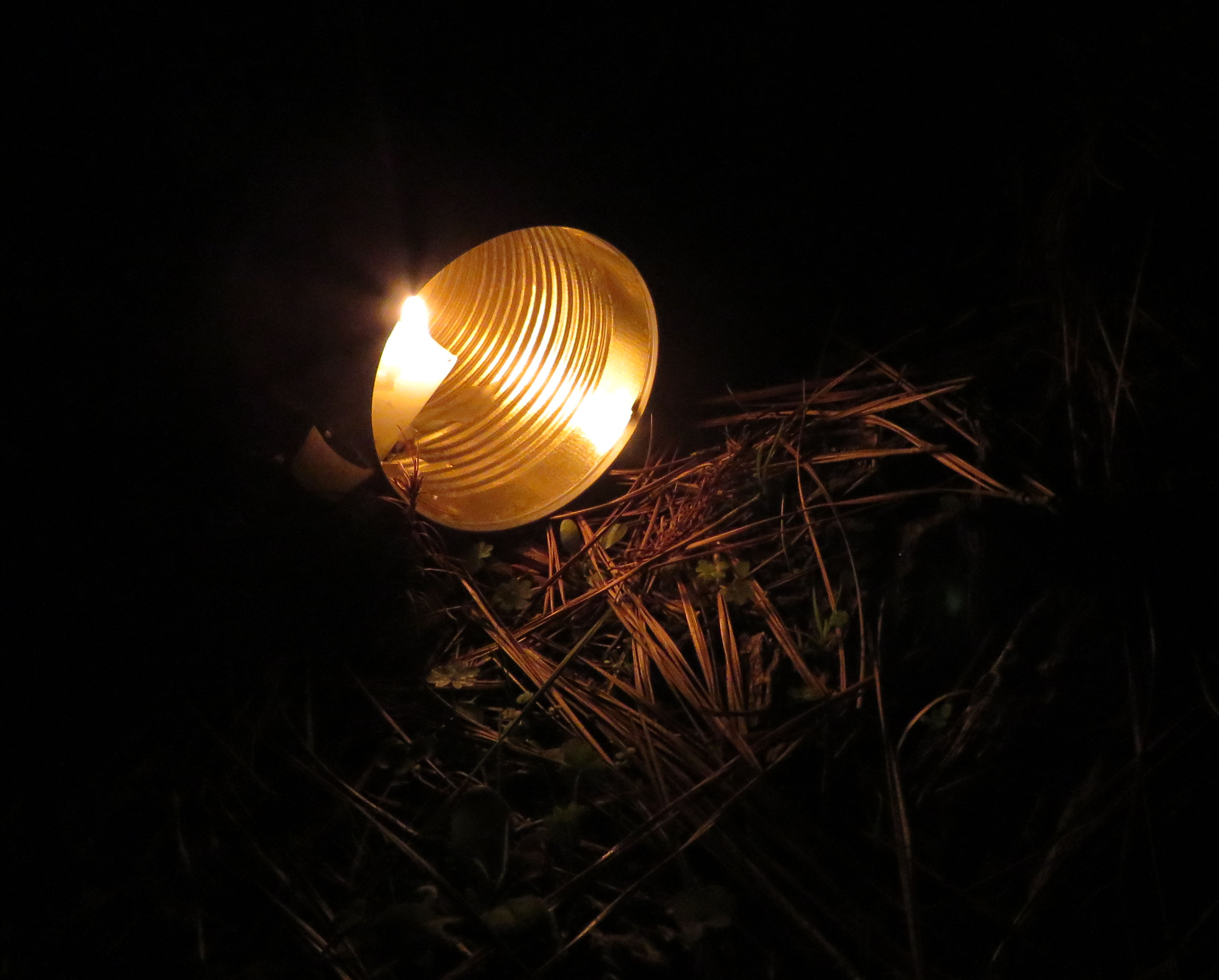 Isabel wrote that they used such a bug to help them see the last few miles of the trail to their house when they had to travel in the dark. I tried it outside — it doesn’t cast much light, but the can protects the candle from blowing out and its shiny interior reflects what light there is. I’m sure if I were trying to come up with something like this on my own, I would have tried to balance the candle stub inside the can, where it would have fallen over, or placed it on the bottom of the can, which would make it useless for trying to aim the light.