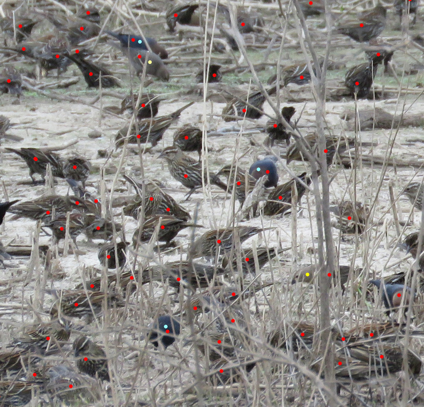 A sample where I marked each bird in the photo with a red dot to count. The blue dots are for Brown-headed Cowbird males and the yellow dots for Brown-headed Cowbird females.