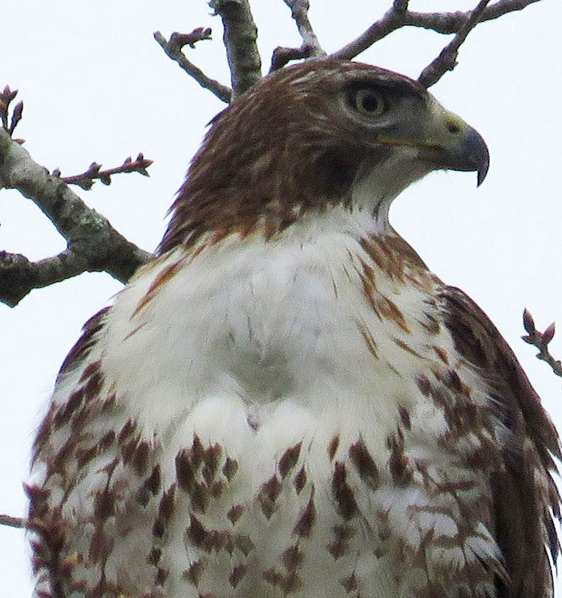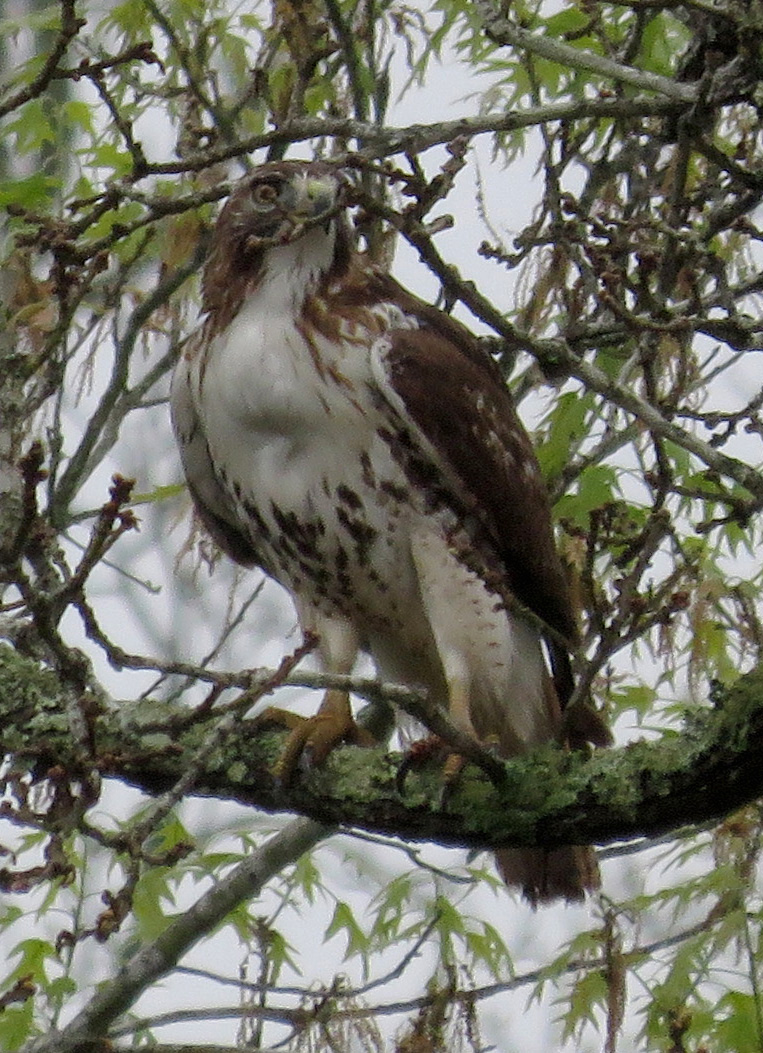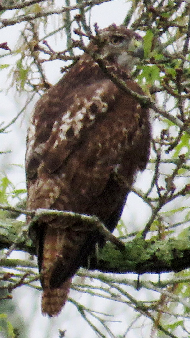 Red-tailed Hawk. The white bars down the scapulars are defining marks. And no other hawk have red tails –but I couldn’t get a good look on this cloudy day, and had to wait until I looked at the photo on my computer.