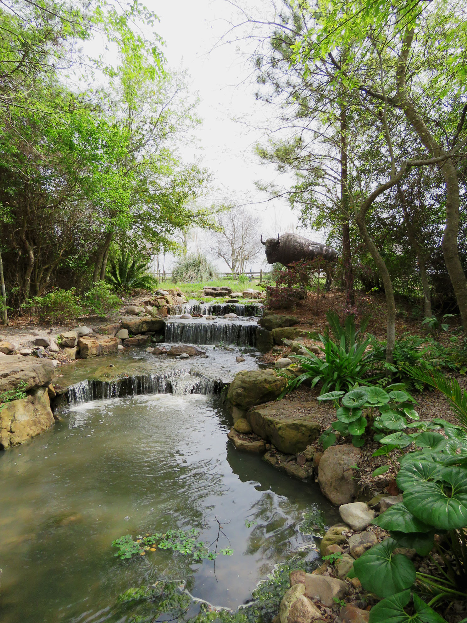 Several birds were hanging out around this tiny wetlands area. In the background is a historic house and a longhorn sculpture.