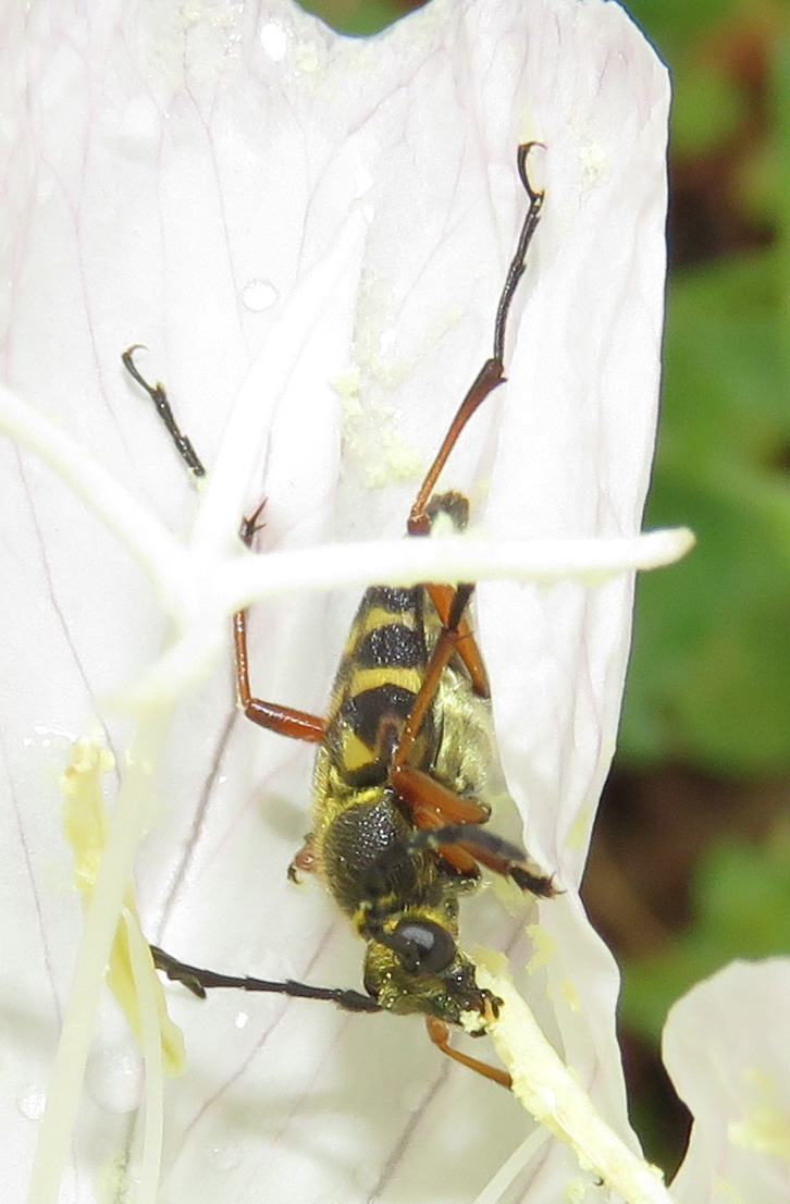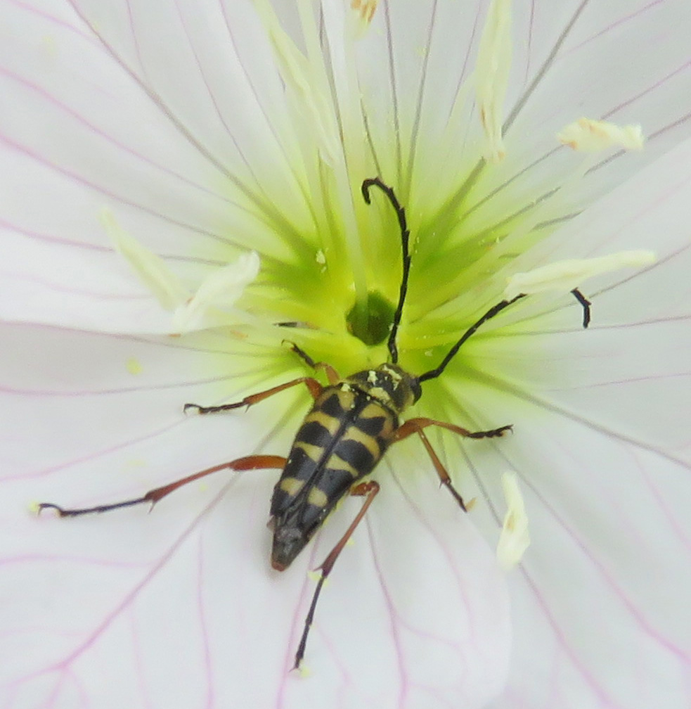 In the same genus as the Zebra Longhorn, this is a Texas Stillingia Beetle, Typocerus lunulatus texanus.