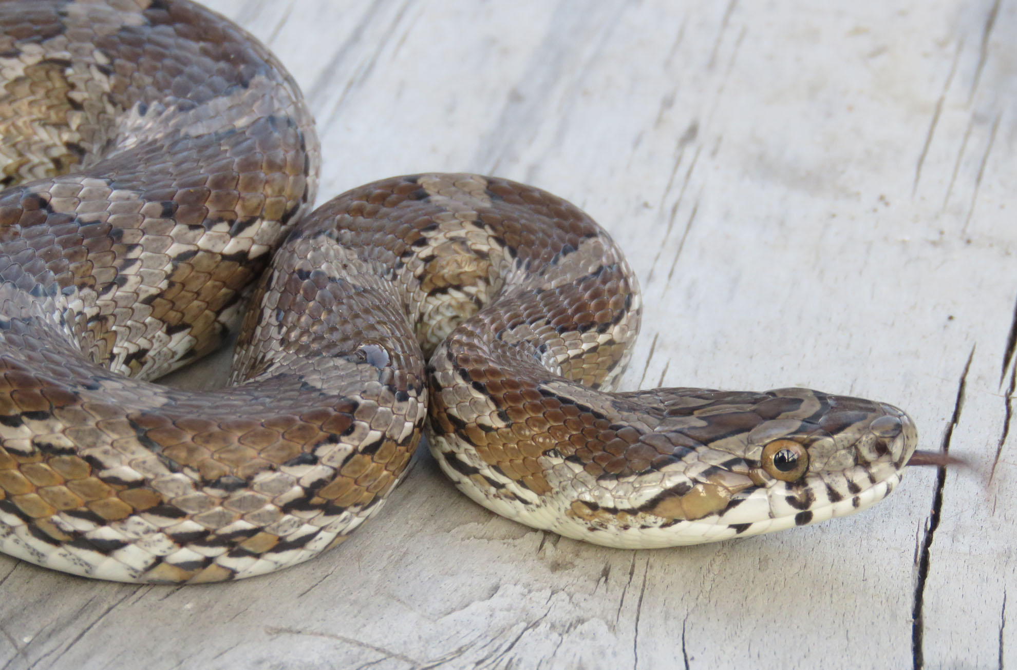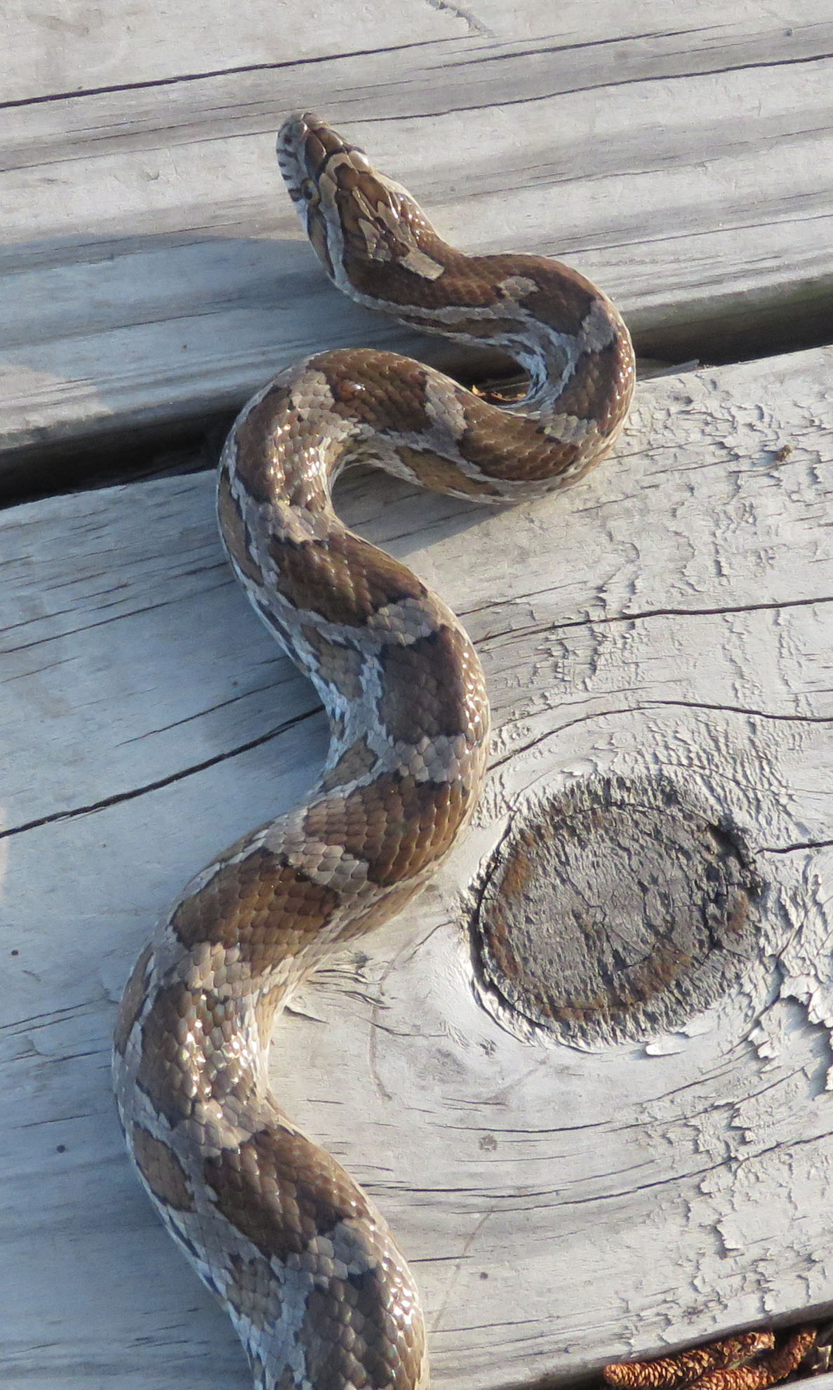 Decades ago, I saw a Corn Snake here, basking in some shallow water. It had beautiful intense cream and red coloring, and for that reason, that species of snake is easy for me to remember. But this one was cream, gray, brown, and black — just like almost every other snake I see. This color combination is not one that helps me figure out the species. On the Wikipedia page, I learned that this combination is called anerythristic — it shows that the snake has a recessive mutation of lacking erythrin pigments, that normally cause the red, orange, and yellow colors.