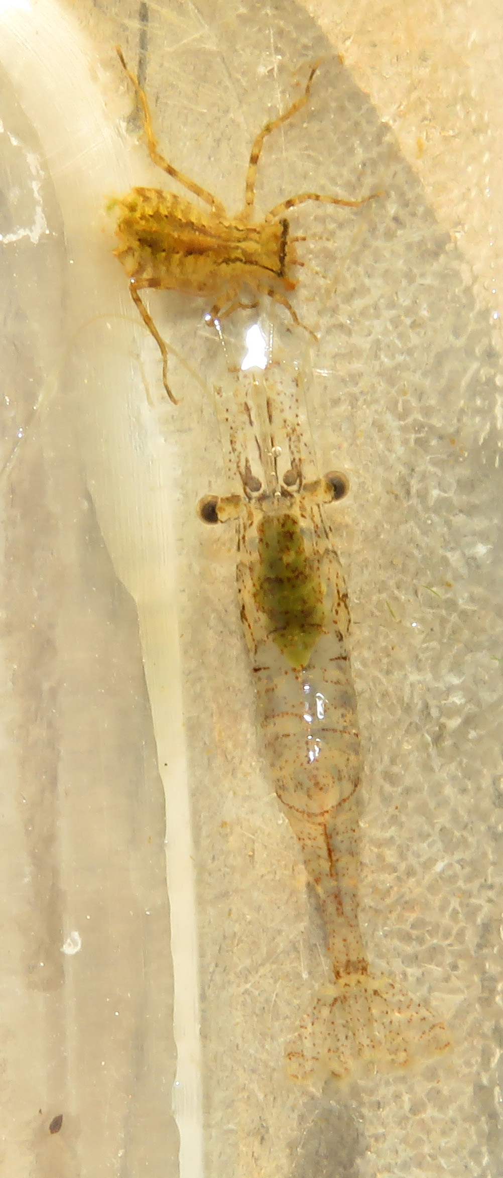 Freshwater shrimp and another nymph. The shrimp was about 1 inch (25 mm) long, and the nymph was only about 1/4 inch long (6 mm).