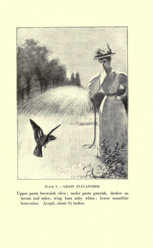 Although the lady in the following illustration looks a little put out, there is a cute story in the book about how the flycatcher came out every day when she watered her garden, to get a little shower bath from her hose.
