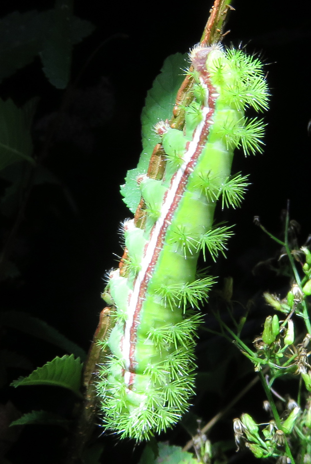 Io moth caterpillar, Automeris io, munching on an elm sapling in late October.