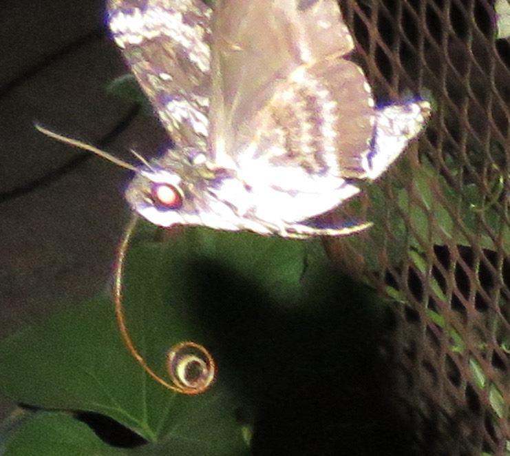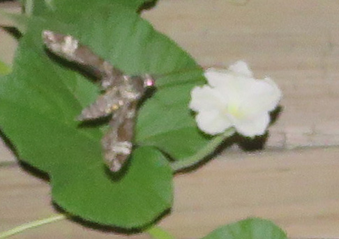 I believe it is pollinating my birdhouse gourd plants, and that solves a mystery in itself! I have very good luck with the gourds forming but I had read that a lot of people don’t. I was curious about their pollinators, but all the online references I found said that no one knew what pollinated them. I am a very lazy gardener and don’t patrol for hornworms, so if they get to adult stage and then pollinate the gourd blooms, that would explain why I have success, and other, more proactive, gardeners don’t.