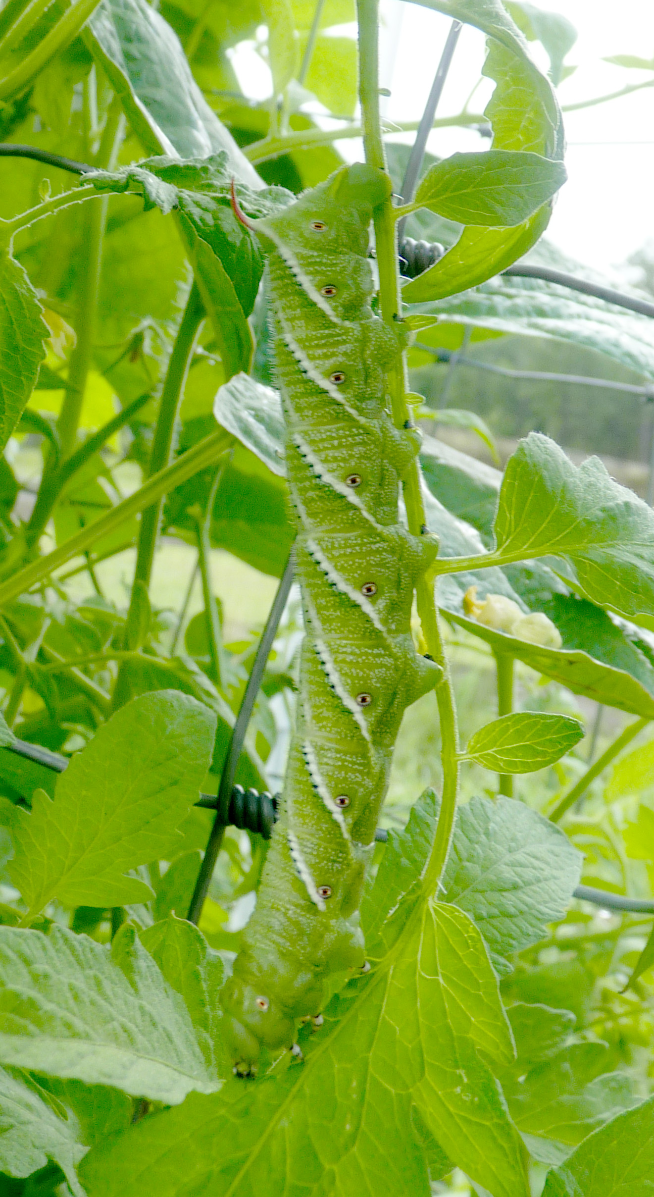 I thought this next one was a Tomato Hornworm, since it was on our tomato plants. I have since learned that is in fact a Tobacco Hornworm, but that both of those species can be found on both plants, and on potato plants as well. Tobacco Hornworms, Manduca sexta, have seven diagonal white stripes and a red or orange “horn”; Tomato Hornworms have eight V-shaped stripes that go over and under the little dark dots on the body, and their “horn” is blue-black.