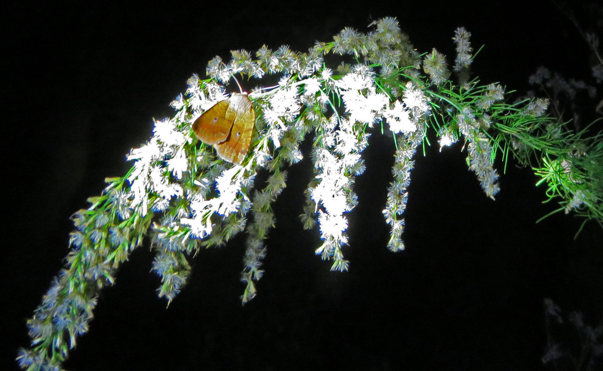 I love taking pictures at night because for once I don’t have the problems of layers and layers of vegetation obscuring my focus point. Obviously I do have some lighting problems. Sometimes I hold a flashlight on the subject and sometimes I use the flash on the camera. The flash captures the colors better, but the light areas get washed out and I have to go back and try to fix it in Photoshop. But I enjoy the sharpness of the photos.