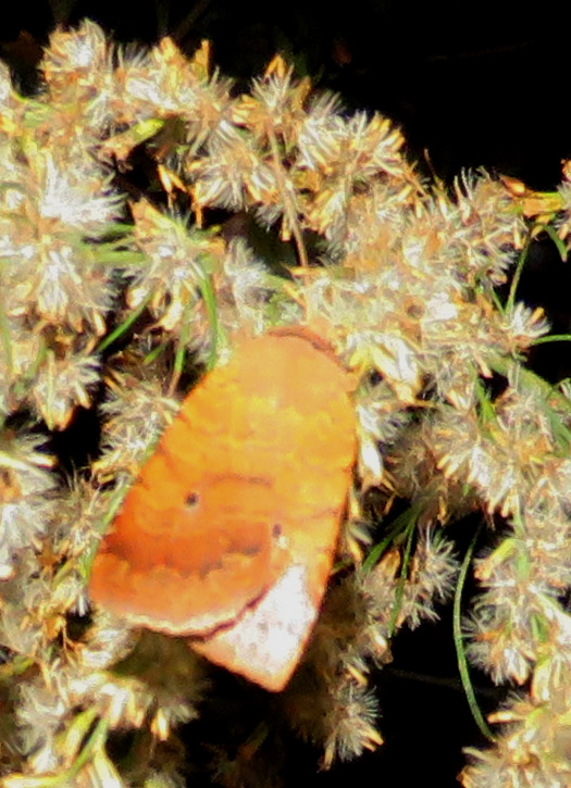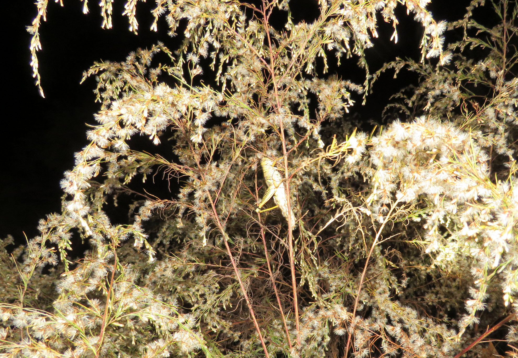 Dog fennel, also known as Yankee weed, looks lovely and feathery in the summer, like asparagus fern. But this time of year it looks blowsy and dry. I don’t have allergies, but this plant looks like something that would cause allergies. I have ignored its tiny nondescript white blooms, not thinking about the fact that white flowers are often attractive to moths. It was buzzing with moths last night, and its tall stems were sheltering grasshoppers.