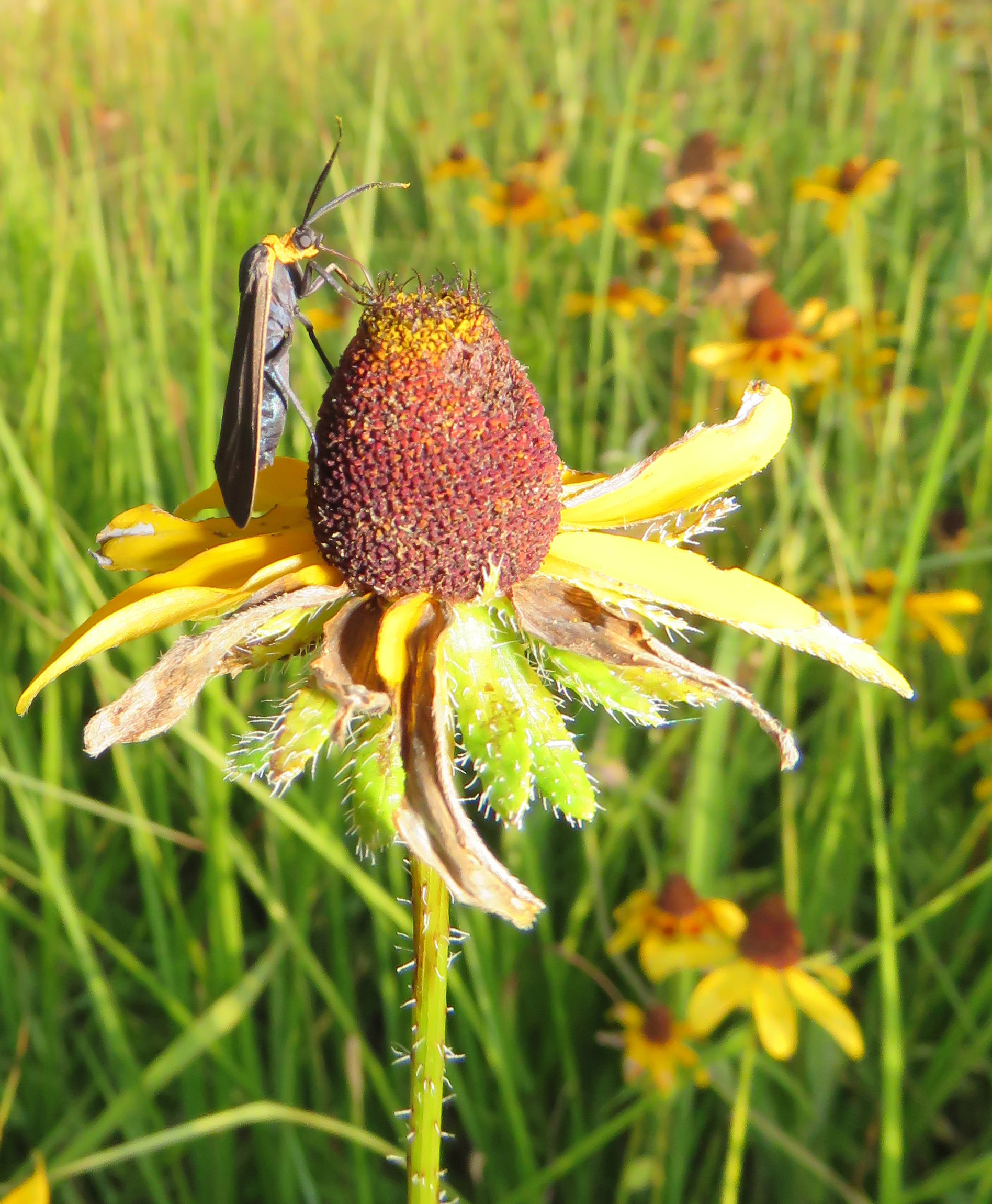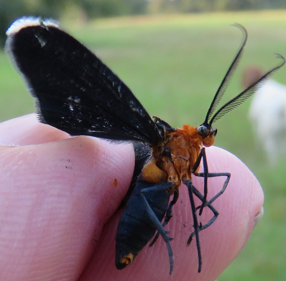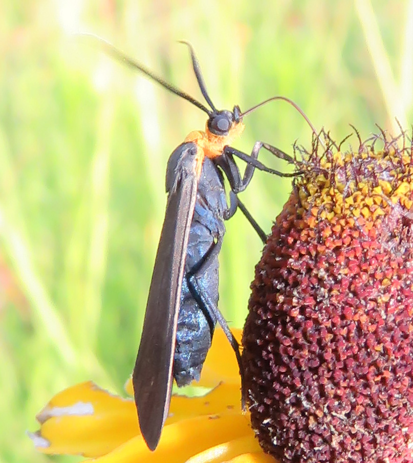 Fortunately BugGuide reported that two other moths were very similar, the Virginia Ctenucha (this name is almost as good because who can even pronounce Ctenucha? But sadly, in spite of its name, it is not found in southeast US) and the more boringly-named Yellow-collared Scape Moth, Cisseps fulvicollis. So based on range, mine had to be the latter.