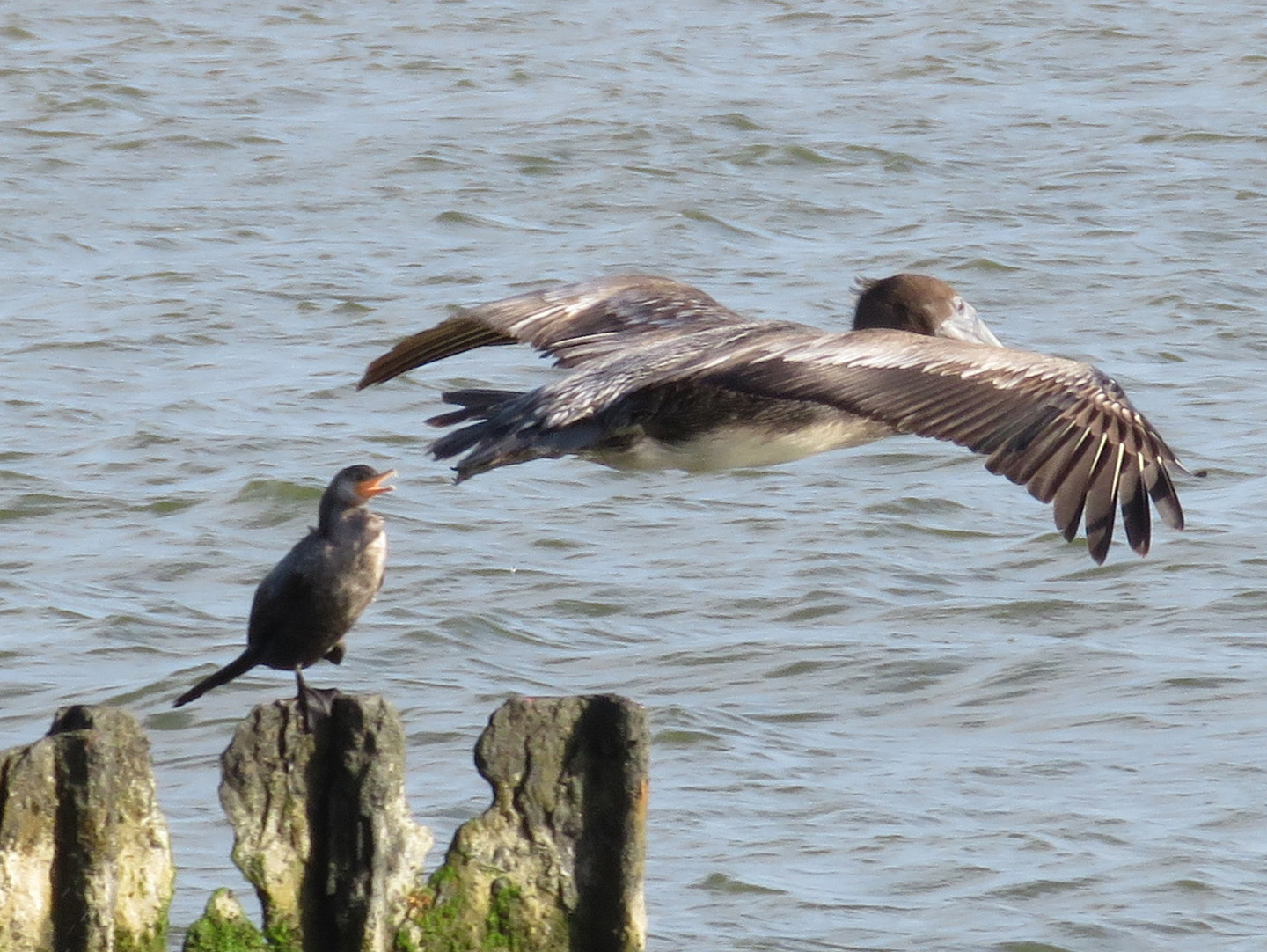 As this Brown Pelican flew by I decided to snap some pictures, even though I see these birds quite often. I didn’t notice the tern racing it, or the cormorants following the action, until I saw the pictures on the computer.