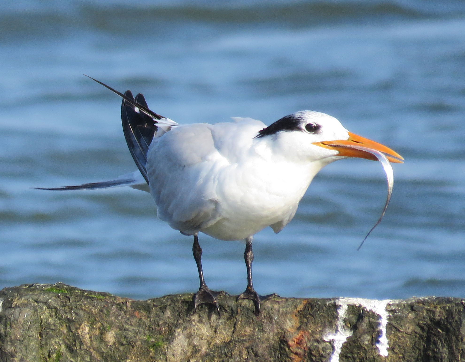 There were a lot of terns sitting on the edge of the dike, and far out in the bay we could just barely see more hovering and diving for fish. Most of the terns we saw were Forster’s Terns, but there were a few Royal Terns too. We saw this one fly up with its catch, and take its time to swallow it completely.