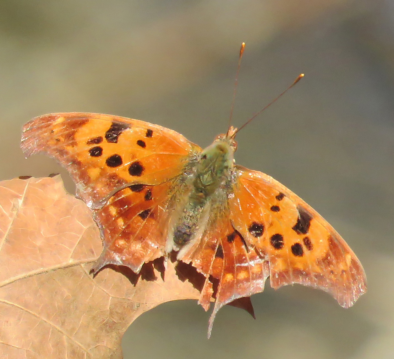 Like Commas, Question Marks are part of the Anglewing genus. Their host plants are supposed to be elms and hackberries, but the butterflies I am seeing are all over the oak trees, and looking at these pictures, you can see how the odd bends and angles of their wings give them perfect camouflage on those old oak leaves. Elms and hackberries have small leaves, about an inch long, with serrated edges, and this time of year, they don’t have any leaves on them at all. The Tvetens say, “The male is aggressively territorial, perching on a tree limb or flying out to challenge any intruder. He seeks a mate during the late afternoon hours.” I am seeing that behavior of perching and then chasing off intruders. So my question is, if their host plants are elms, why are they defending oaks? And from whom? There are way more old oak leaves than there are Question Marks, it seems to me.