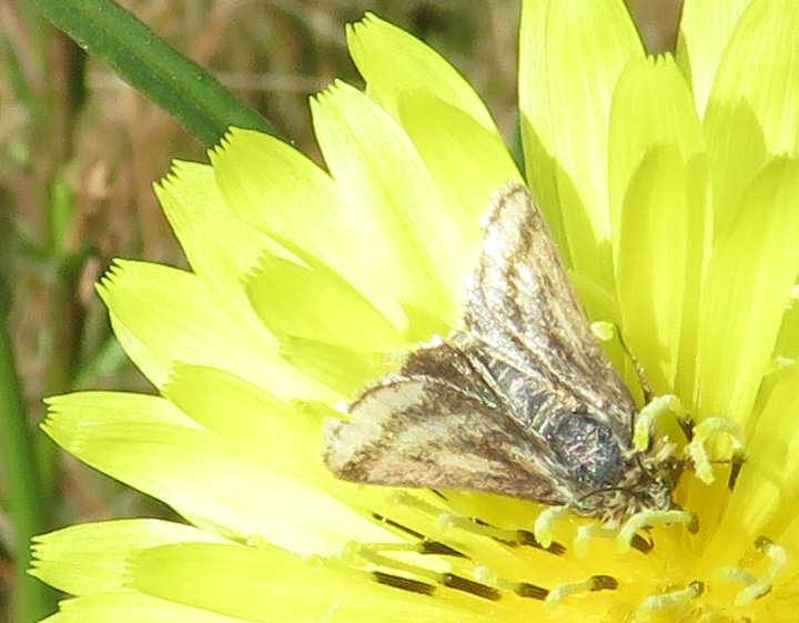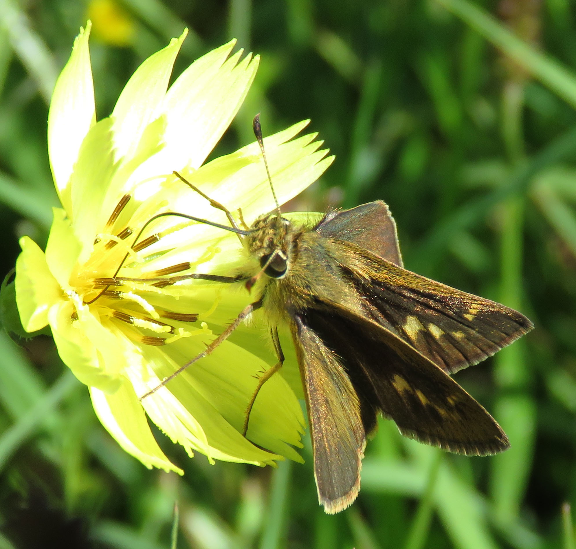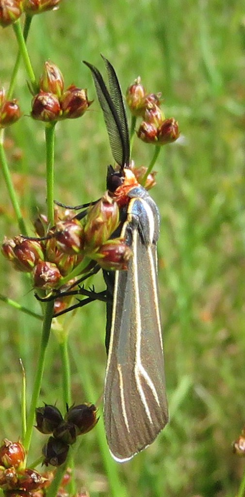 Veined Ctenucha moth, Ctenucha venosa. I followed it from the dandelion over to this grass seed head stalk.