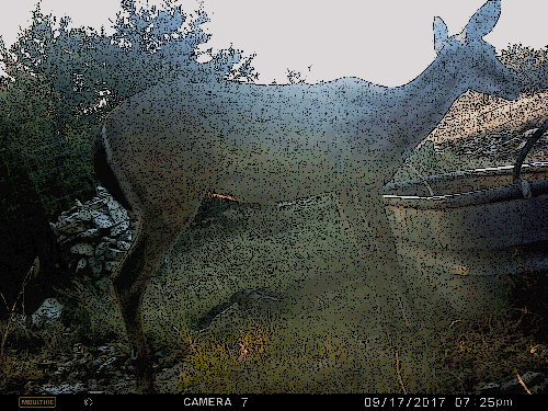We caught these two on the wildlife camera this past September. Unfortunately the light wasn’t good and there was hardly any contrast in the photos, so I used Photoshop Elements® to make them a little more interesting.