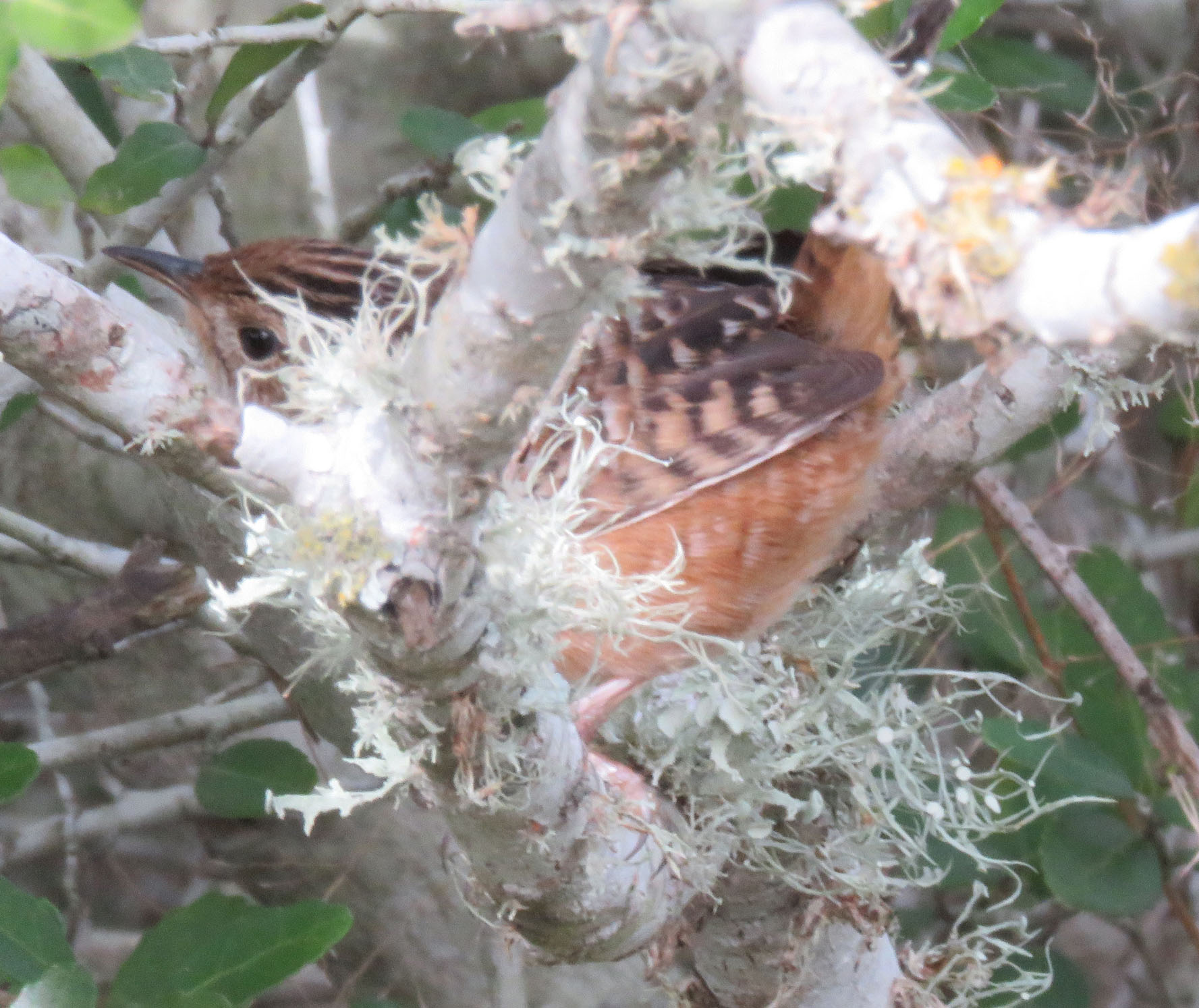 While I was walking, I kept seeing sparrows swoop through the grass. I followed one over to a little group of yaupon shrubs. It stayed hidden but another bird popped out and studied me.