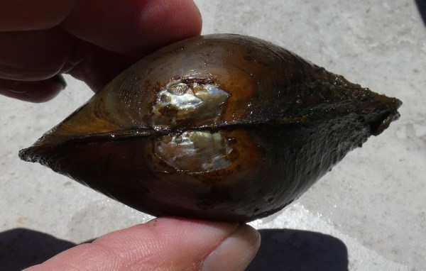 Shortly after I found the scattered shells, my husband was working in the pond and found two live mussels.  He brought them up so I could take pictures, and then of course we returned them to where he found them.