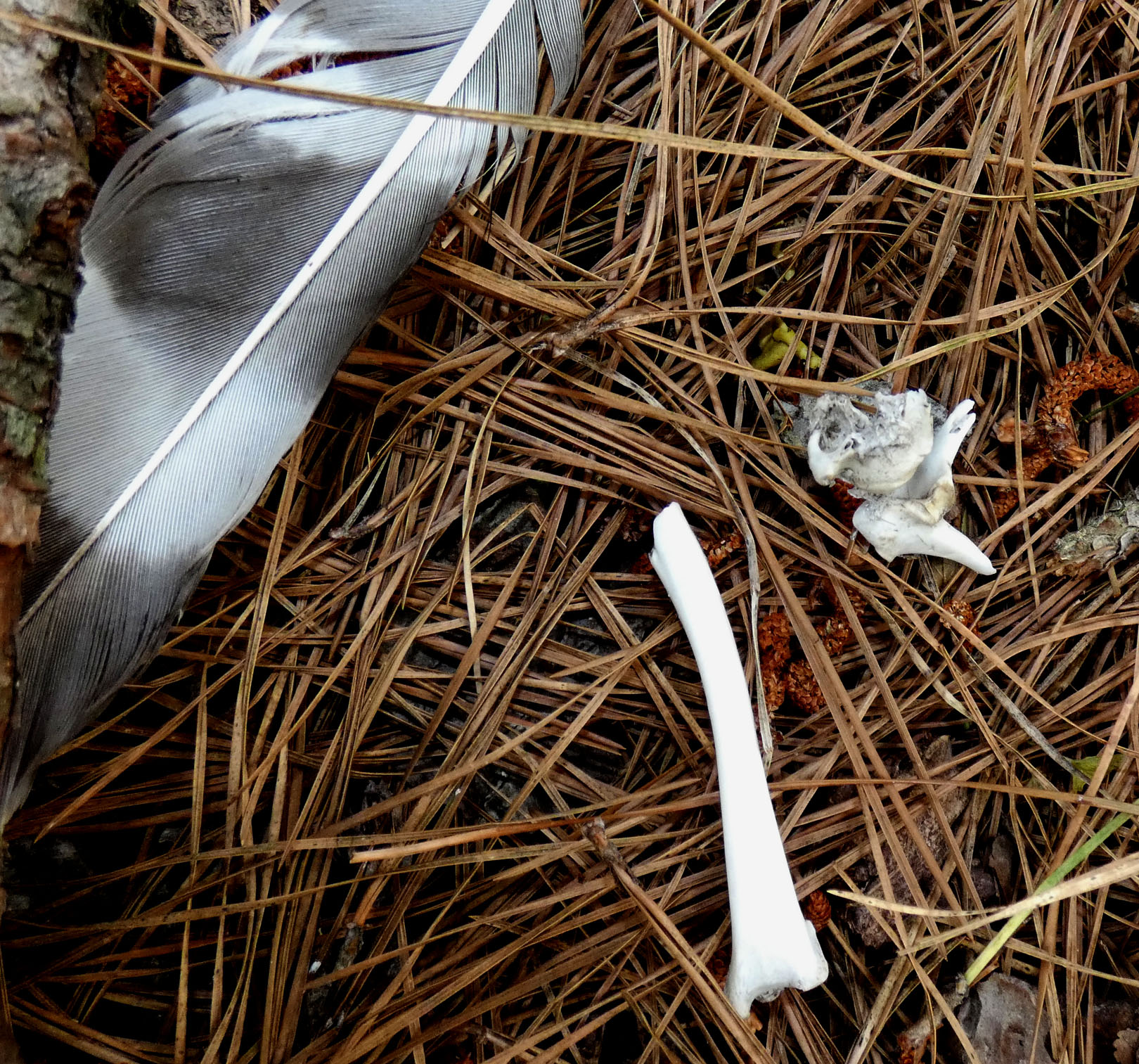A few days ago, I spotted some large feathers scattered under a big pine tree.  The longer I looked, the more I saw.  I might have thought “Was this bird molting?” but then I spotted a clump of feathers still attached to a bone!  Then I found more bone fragments.