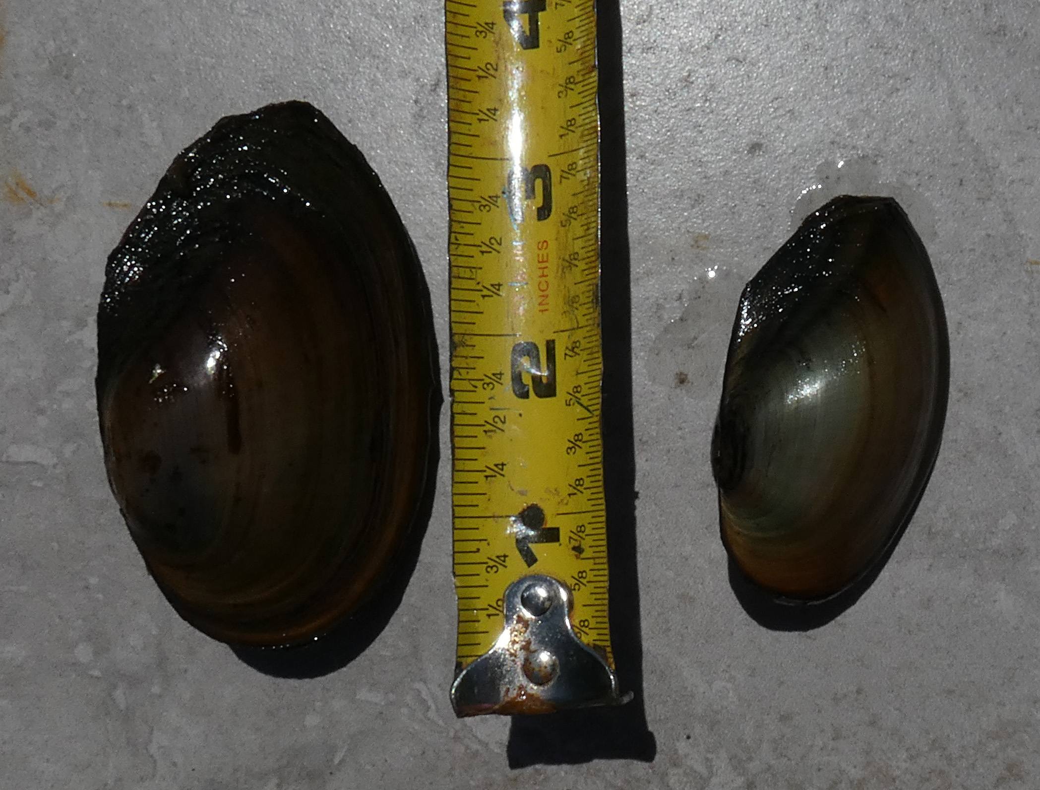Shortly after I found the scattered shells, my husband was working in the pond and found two live mussels.  He brought them up so I could take pictures, and then of course we returned them to where he found them.
