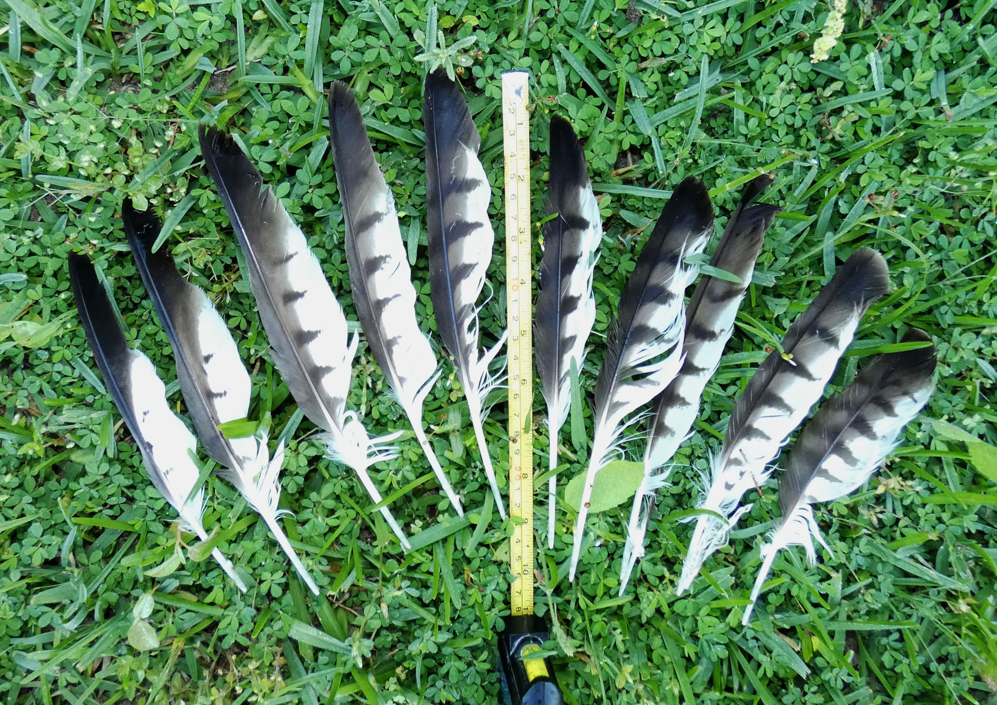 Feathers from Tree 1, arranged as best I can. They look to be wing feathers from a hawk.
