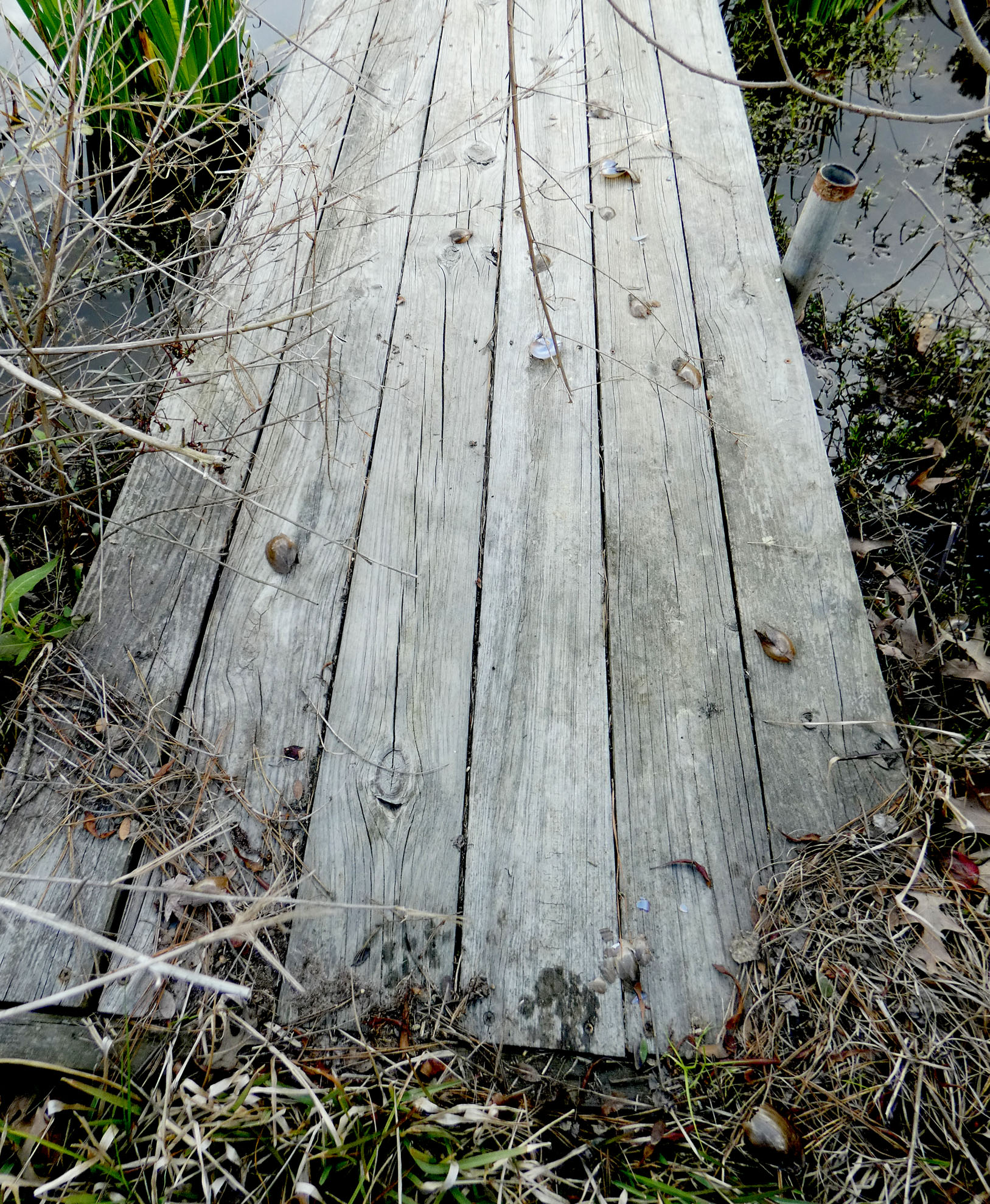 Mystery #2: Who scattered these pond mussels on the dock?  It seems like if it had been a raccoon or a fox, they would have left the shells right on the shore line, not carried all of them out to the dock.