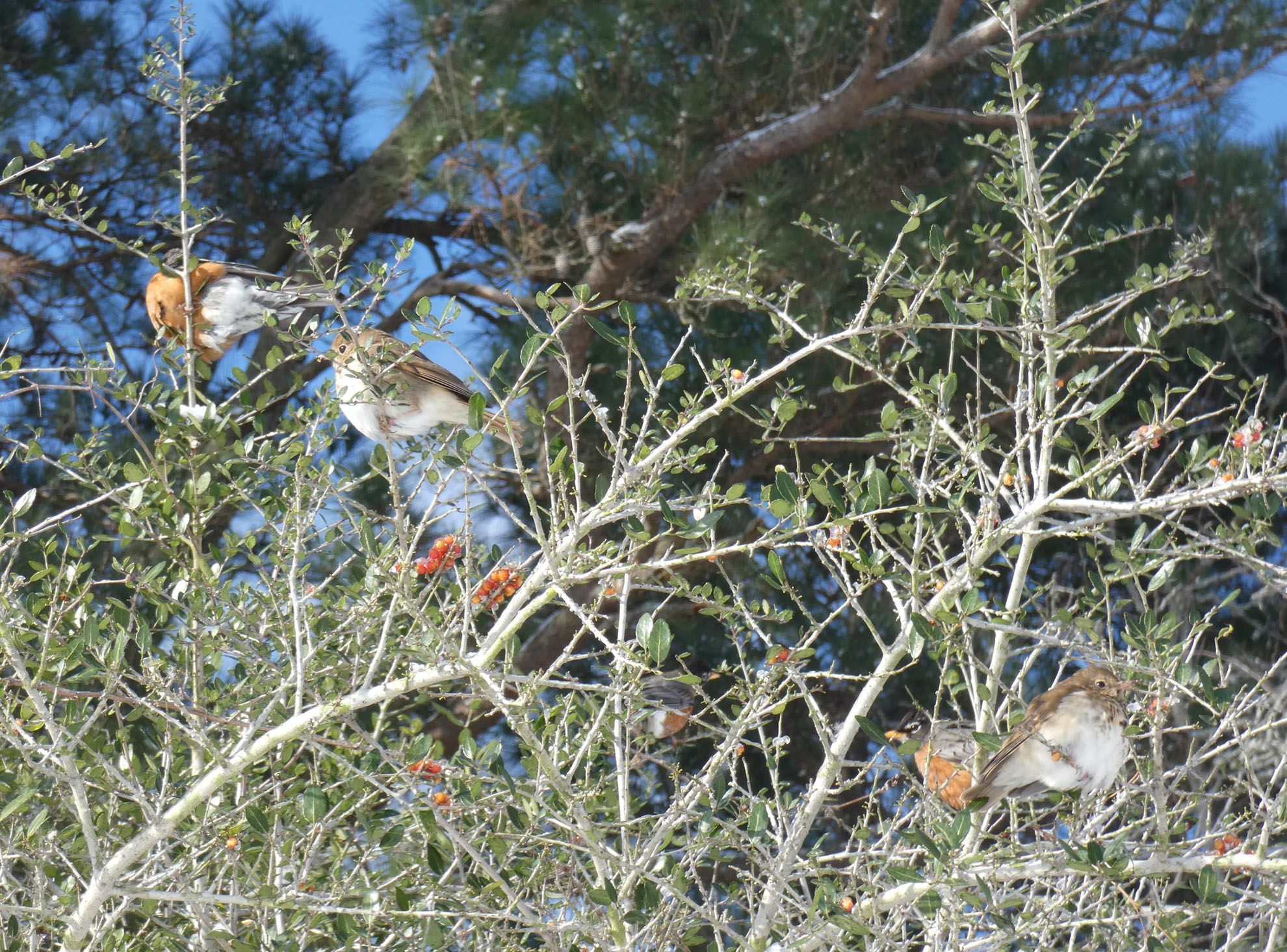 Robins and Hermit Thrushes clearing off a yaupon bush.