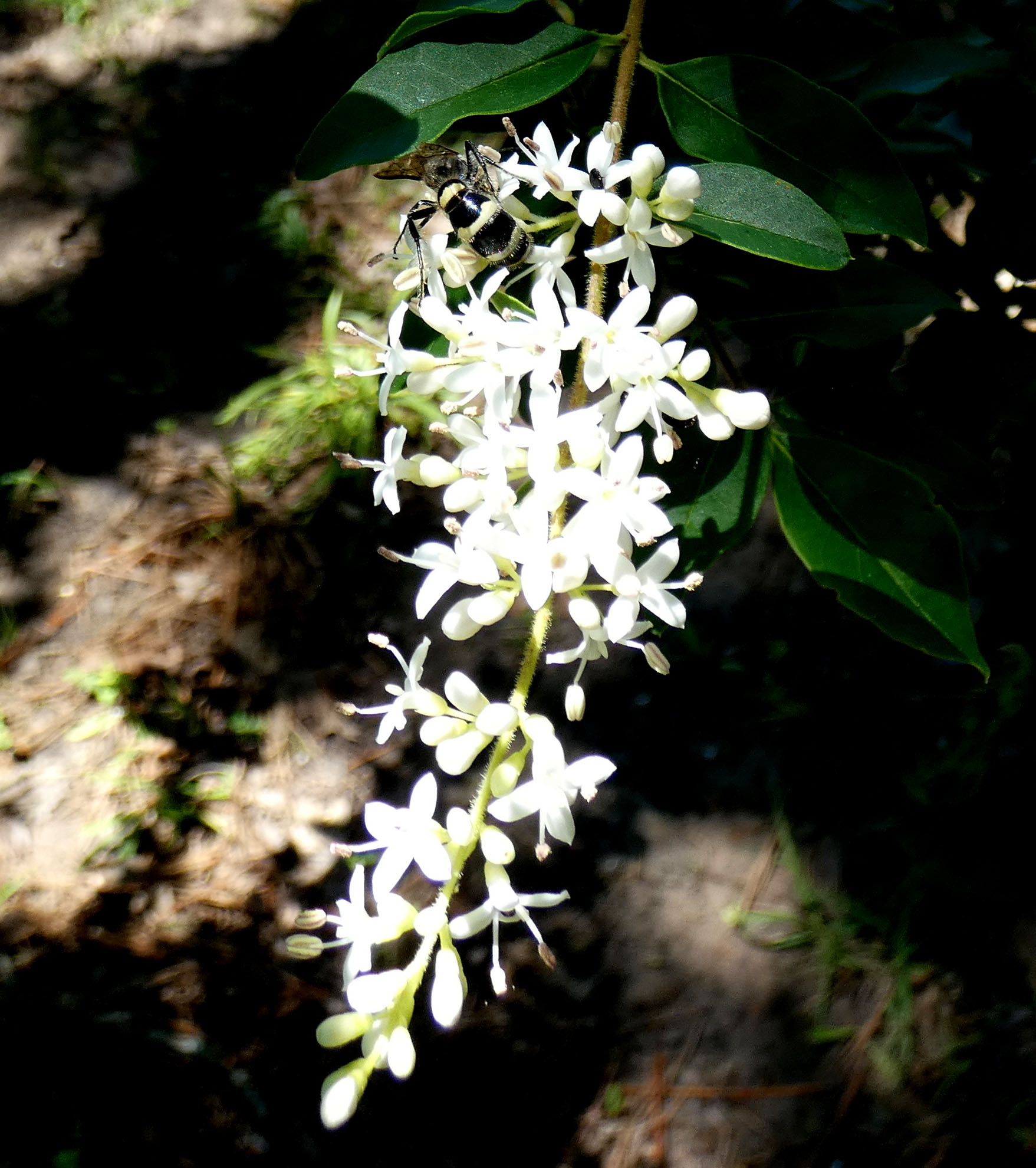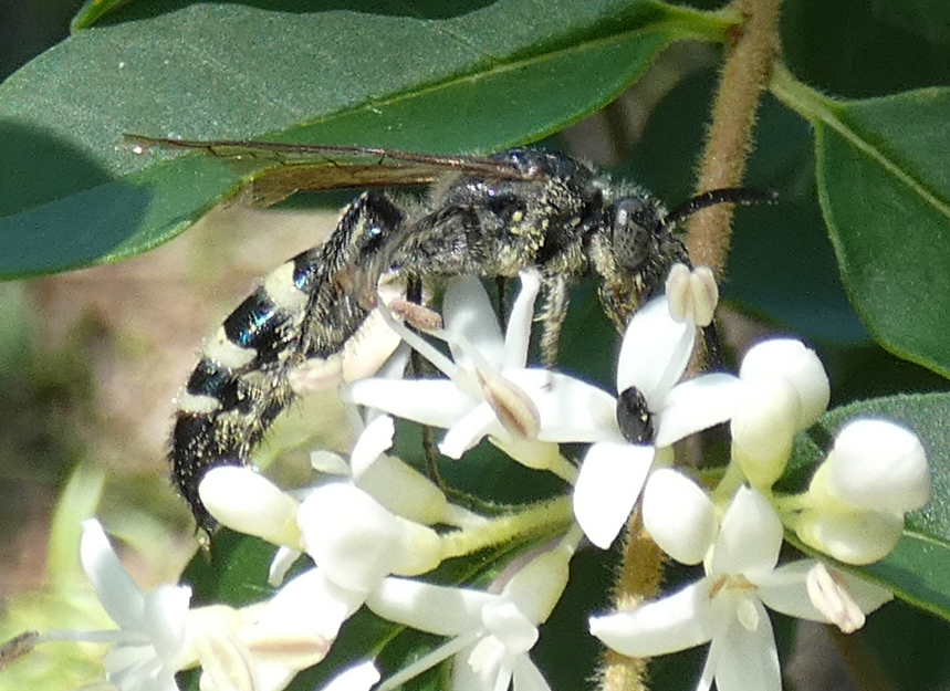 When I was almost back to the house, I saw these sprays of white blossoms, and a Feather-Legged Scoliid Wasp was exploring them. It had beautifully patterned gray and black eyes.