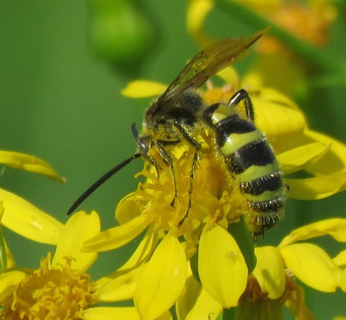 Hairy-footed Scoliid Wasp, Dielis pilipes. Scoliid wasp larvae parasitize beetle larvae, but the adults eat nectar.