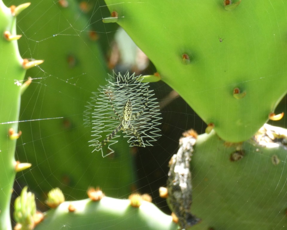 Tiny spider in a big web marking, suspended between prickly pear pads.
