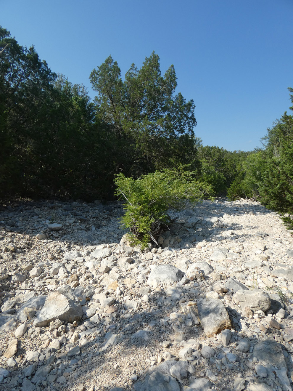 To get to this spot in the Hill Country of Texas, we will have to get off the paved county road and drive about 30 minutes on caliche road.  Then we will park the truck, and walk for 15 minutes up this dry creek.