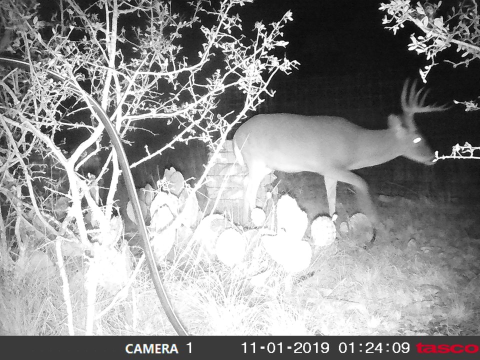Whitetail buck at the water trough. (The hose comes to the trough from a storage tank.)